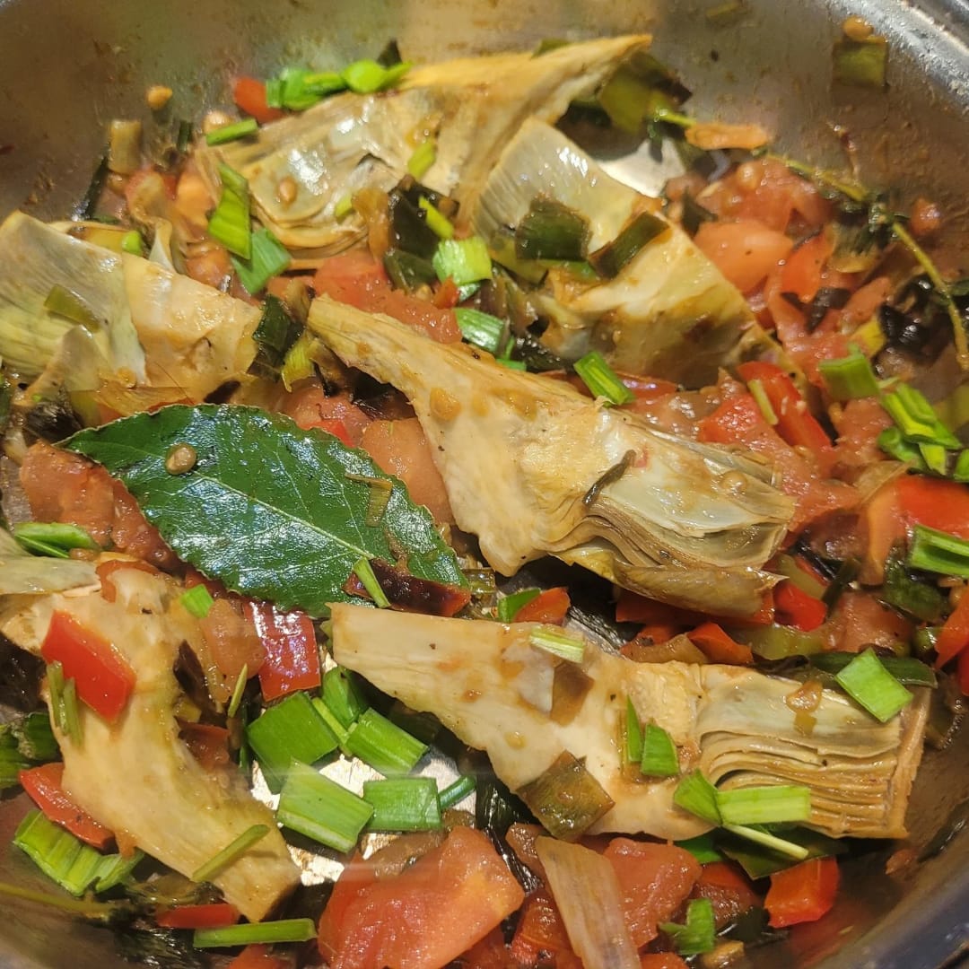 7. Agregar los corazones de alcachofa y demás ingredientes, excepto el agua, ajos, tomate y los balúes. Tip: si los corazones son grandes y muy gruesos, volver a cortar, por mitades o al través.